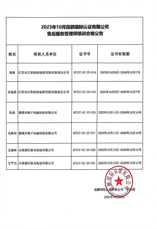 售后服务管理师培训合格公告——2023年10月