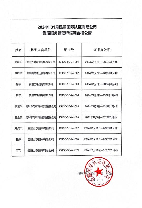 售后服务管理师培训合格公告——2024年01月