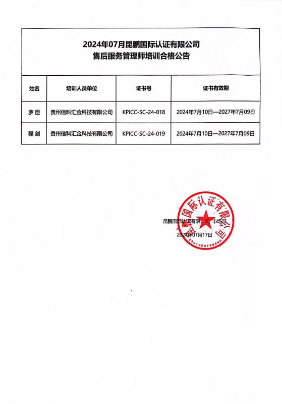 售后服务管理师培训合格公告—2024年07月