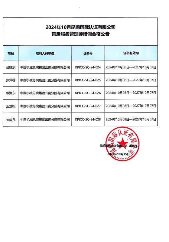 售后服务管理师培训合格公告—2024年10月