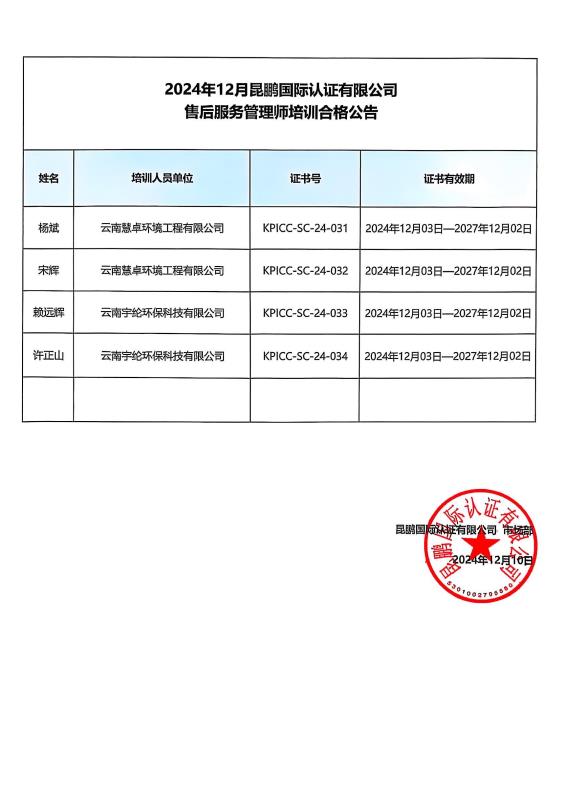 售后服务管理师培训合格公告—2024年12月